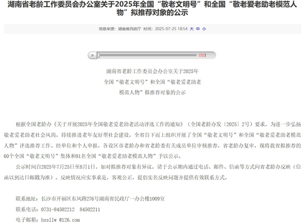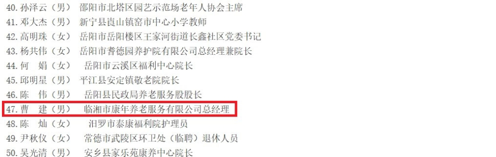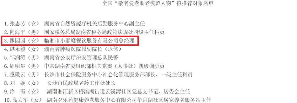近日,湖南省2025年“敬老月”活动启动仪式在长沙举行。我市小家庭餐饮服务有限公司总经理瞿园园和市康年养老服务有限公司总经理曹建获全国“敬老爱老助老模范人物”拟表彰对象。
