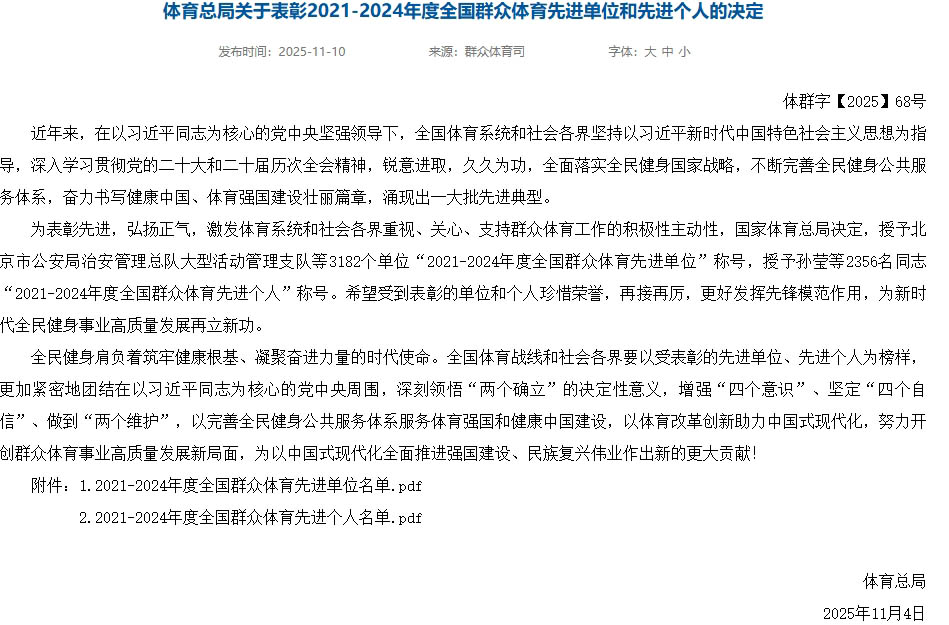 近日,国家体育总局发布《关于表彰2021-2024年度全国群众体育先进单位和先进个人的决定》。其中,我市教体局获得“全国群众体育先进单位”表彰,市文武学校武术总教练陈青山获得“全国群众体育先进个人”表彰。