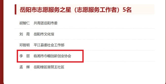 近日,2025年度岳阳市志愿服务先进典型评选结果正式公布,我市新时代文明实践协会谌玉海荣获岳阳市“志愿服务之星”个人称号,市巾帼创新创业协会李丽荣获岳阳市“志愿服务之星”工作者称号。
