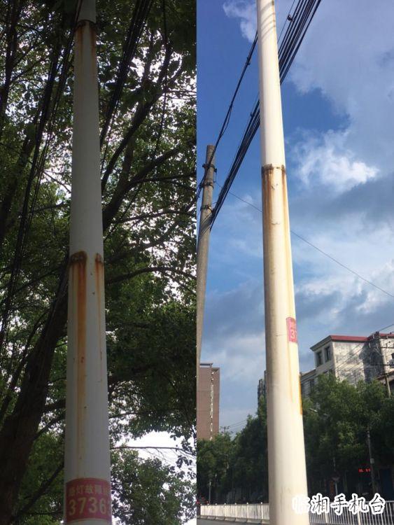 (刷漆翻新前锈水横流、外观残旧的路灯杆)