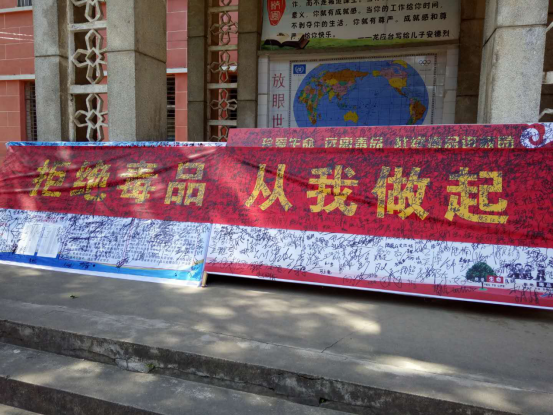 活动现场设置禁毒知识展板和签名条幅,组织千人禁毒签名活动,全校师生以及部分学生家长参与签名活动,承诺“拒绝毒品,从我做起”。