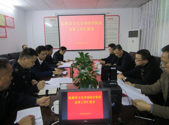 (陈玲英)为落实岳阳市委深化机构改革领导小组《关于深化全市文化市场综合行政执法改革的实施方案》,加快推进文化市场综合执法改革任务的落实,12月27日,岳阳市文化旅游广电局副局长丁建兵、文化市场综合执法局局长谭建武一行4人来临湘市调研文化市场综合执法改革工作情况,临湘市文化旅游广电局党组书记、局长陆如勇和副局长丁清利、大队领导班子成员参加会议。