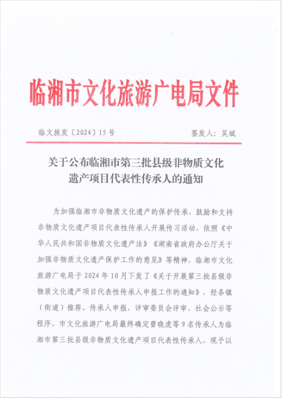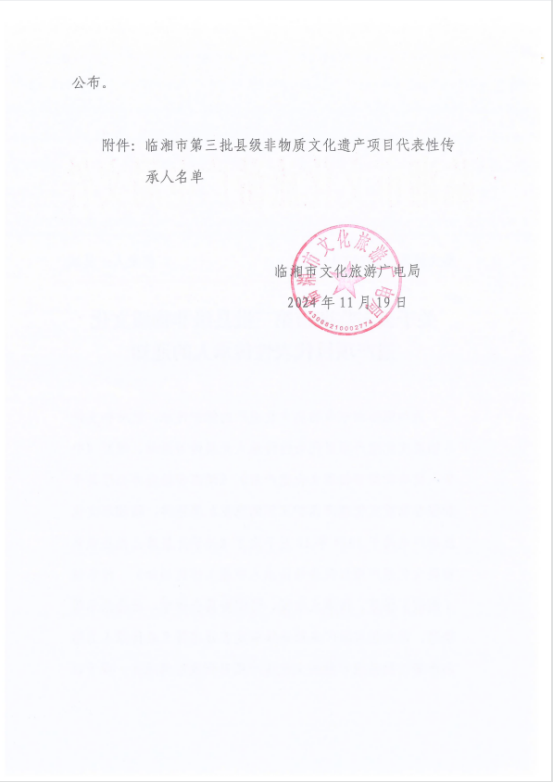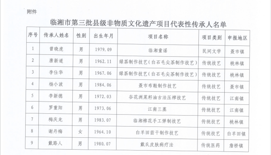 近日,临湘市文化旅游广电局公布了第三批县级非物质文化遗产项目代表性传承人名单。第三批县级非物质文化遗产项目代表性传承人申报工作自10月份启动以来,通过镇(街道)推荐和传承人自主申报、专家评审委员会评审、社会公示等程序,最终确定了9名代表性传承人。