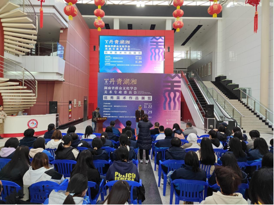 由湖南省文化馆、湖南省群众文化学会主办的第四届“丹青湖湘”湖南省群众文化学会美术专业委员会优秀美术作品展于本月22日开幕,本次展览共精选出包括国画、油画、版画、水彩等作品80幅,我馆美术专干李金雪漆画作品《忆·临湘天狮》入选。