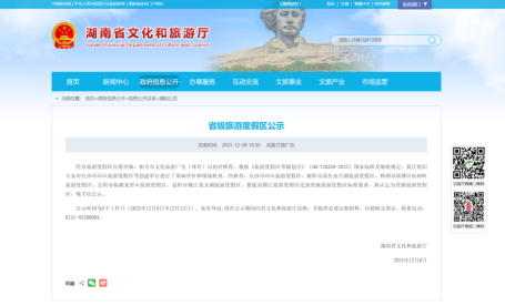 (通讯员:余祥)12月8日,湖南省文化和旅游厅官网发布公示,经各旅游度假区自愿申报,相关市文化旅游广电(体育)局初评推荐,根据《旅游度假区等级划分》(GB/T26358-2022)国家标准及细则规定,湖南省文化和旅游厅组织专家对长沙市印山旅游度假区和我市龙窖山旅游度假区等创建单位进行了基础评价和现场检查。拟认定6家省级旅游度假区,我市龙窖山旅游度假区列入公示名单,公示期为2025年12月8日至12月12日。名单如下: