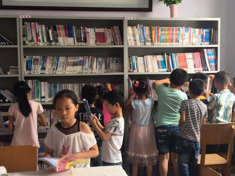 桃矿街道办事处综合文化站文化志愿者正在组织留守儿童看书