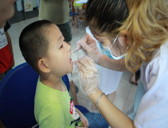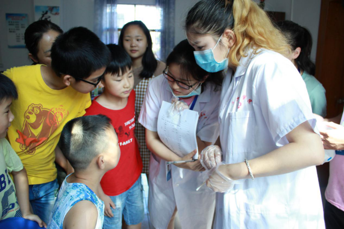 长沙医学院新青年团队正在桃矿街道办事处综合文化站为留守儿童检查口腔