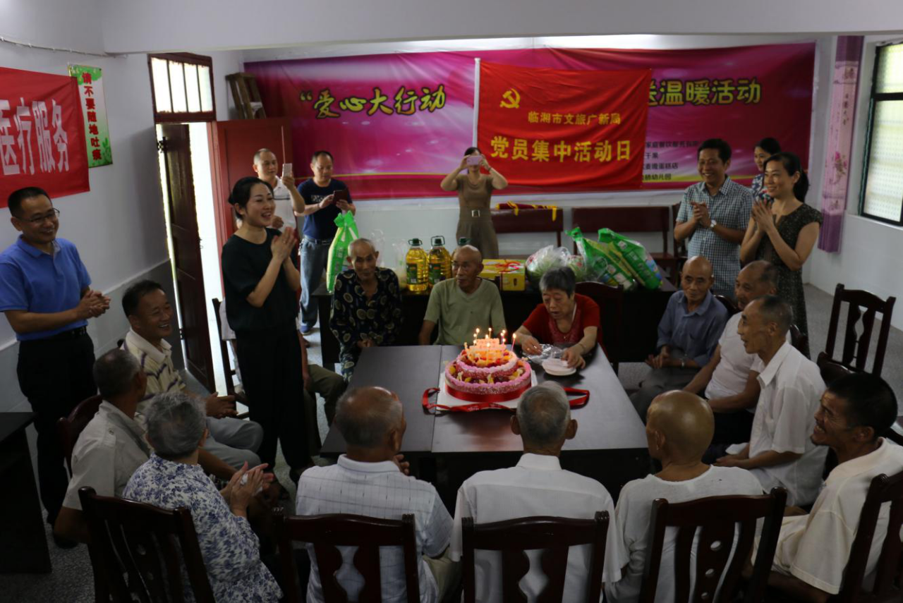 “祝你生日快乐,祝你生日快乐……”一阵阵温婉柔和的歌声在临湘市五里牌街道办事处敬老院里悠然飘出,正在切生日蛋糕的寿星陈光明爷爷激动得热泪盈眶地说:“活了77年没有人为我做过寿,今天真是让我终身难忘啊!”8月10日,中共临湘市文化旅游广电新闻出版局机关支部委员会创新“党员活动日+”形式,在副局长汪军红、张国良、丁清利、工会主席龙慧的带领下,顶着夏天的炎热,不辞辛苦,带着一车美味香甜的水果、大米、食用油、生日蛋糕等来到五里敬老院看望孤寡老人,给他们送去了慰问品,送去了爱心和温暖。