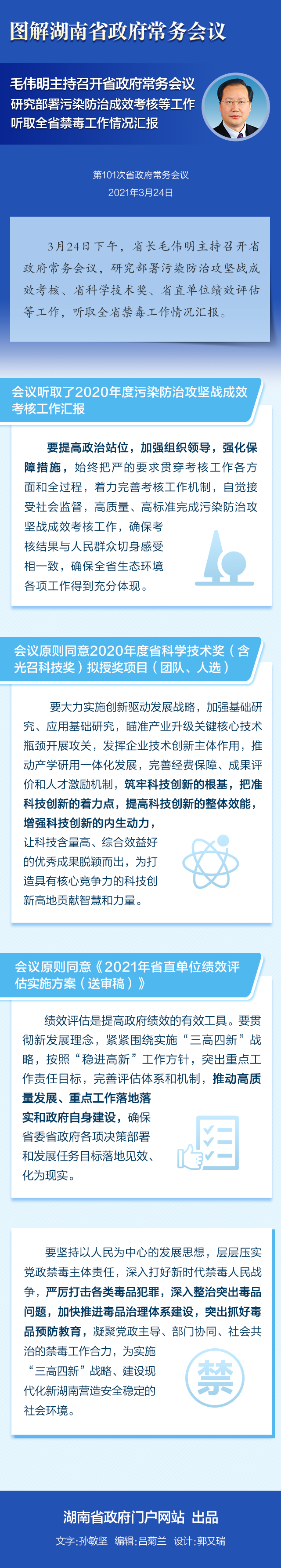 3月24日下午,省长毛伟明主持召开省政府常务会议,研究部署污染防治攻坚战成效考核、省科学技术奖、省直单位绩效评估等工作,听取全省禁毒工作情况汇报。