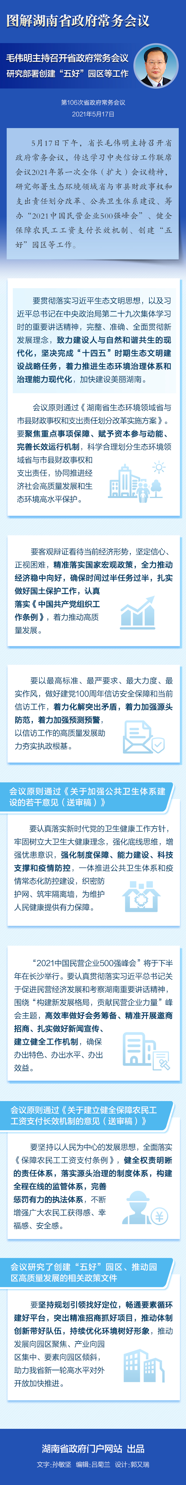 5月17日下午,省长毛伟明主持召开省政府常务会议,传达学习中央信访工作联席会议2021年第一次全体(扩大)会议精神,研究部署生态环境领域省与市县财政事权和支出责任划分改革、公共卫生体系建设、筹办“2021中国民营企业500强峰会”、健全保障农民工工资支付长效机制、创建“五好”园区等工作。