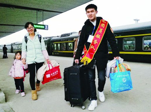 1月26日,道州火车站,党团员服务队的志愿者为旅客搬运行李。春运以来,道县志愿者们活跃在车站、码头,为旅客提供服务,给疲惫的旅途注入一丝丝温暖。