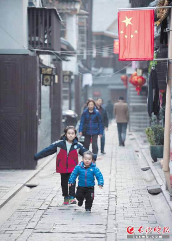 国旗和灯笼把西园北里历史步道装点得年味十足。小孩们兴奋地在青石板路上追逐。