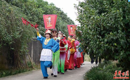 2月1日,浏阳市普迹镇乡间小道上锣鼓喧天,身着盛装的竹马灯队欢腾起舞。彭红霞 摄