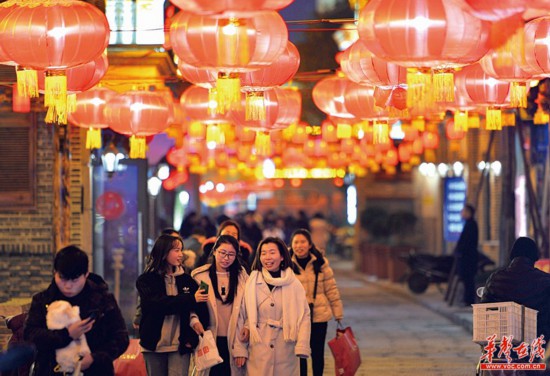 1月31日晚,长沙市芙蓉区登隆街,市民行走在火红的灯笼下。记者 李健 摄