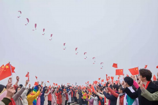 在歌曲高潮部分,10架动力伞从远空滑翔而来,挂上鲜艳的五星红旗。同时,一艘载客近千人的大游轮开足马力,驶向洲头。此时,船上、岸上、天上“海陆空”三处合体,瞬间引爆全场激情,万人挥舞国旗,高声同唱《我和我的祖国》,给祖国送上新春祝福。
