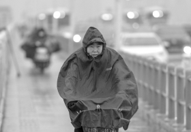 2月17日,长沙持续低温雨水天气,不管是骑自行车、电动车的市民,还是执勤的 交警,都把自己裹得严严实实。组图/记者辜鹏博