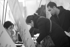 2月18日,2019年湖南省“春风行动”启动仪式暨农民工专场招聘会在湖南长沙人力资源服务产业园举行,求职者正在现场查看招聘信息。图/记者杨旭