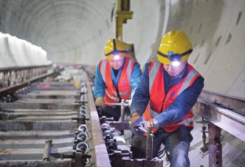2月22日,长沙地铁5号线白茅铺站,工人正在进行铺轨施工。目前,长沙地铁5号线一期(时代阳光大道至蟠龙路)18个车站主体已完工,进入附属结构(地铁出入口、风亭、铺轨)施工阶段,有望今年6月实现全线洞通,年底实现轨通。 傅聪 陈月红 摄影报道