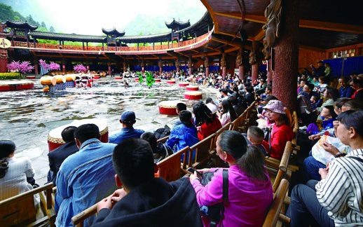 5月2日,游客在吉首市德夯风景名胜区欣赏文艺表演。“五一”小长假期间,该景区内的优美大峡谷,浓郁苗族风情,独特自然风光,吸引了络绎不绝的游客前来观光游览。(姚方 摄)