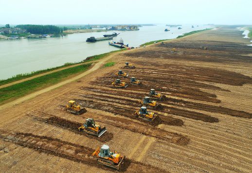 2018年6月14日,沅江市漉湖芦苇场下塞湖矮围整治现场,约7200米长的泥堤已被荡平。自2018年6月3日起,益阳市启动下塞湖矮围集中拆除“攻坚战”,投入100多台(套)大型机械设备施工。