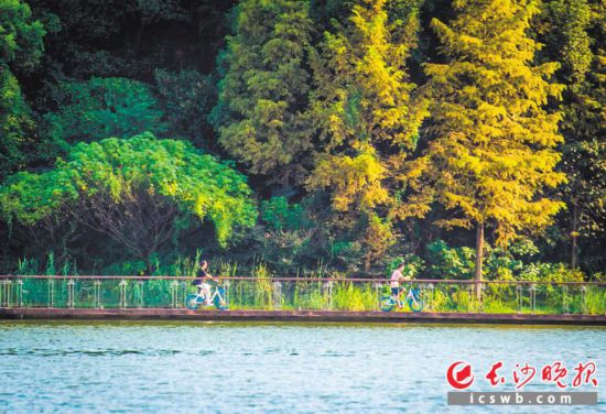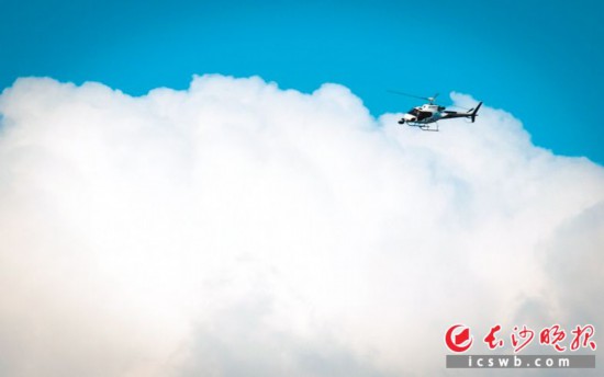 27日,长沙晴空万里,天蓝水碧,几朵白云洋洋洒洒地点缀在空中,随风飘动。梅溪湖上空,一架直升机从云层上飞过,市民们沿湖自由地骑行,感受美好时光。长沙晚报全媒体记者 邹麟 摄