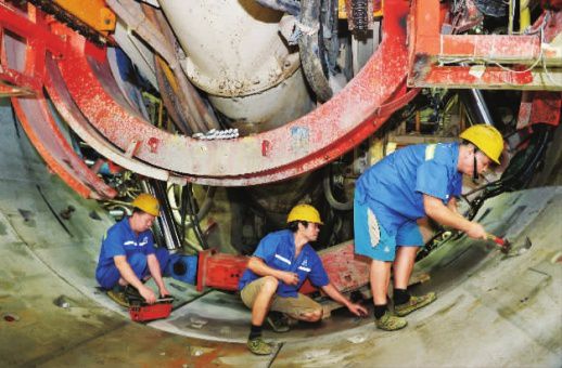10月4日,长沙地铁6号线麓枫路站,中建五局施工人员在进行管片拼装。国庆节期间,该站50余名工人全员在岗,确保地铁施工进度。(记者 傅聪 摄)