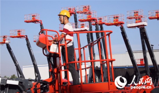 工人在星邦重工高空作业平台作业(袁蒙 摄)