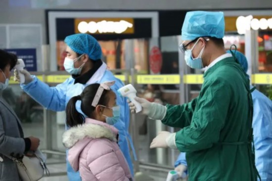 (1月28日下午,怀邵衡铁路隆回站进口,医务人员对旅客一一进行体温检测,防控疫情。罗理力摄)