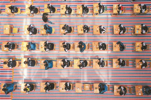 4月16日,长沙市天心区长郡湘府中学,学生在“方舱食堂”吃饭。为解决3000余名师生的用餐问题,该校将学校的体育馆改造成“方舱食堂”,在800平方米的空间内摆放了480张桌椅,学生凭借自己的编号入座就餐。此举弥补了原有食堂空间、餐位不足的缺陷,以保证所有学生在合理时间内安全用餐。记者 辜鹏博 摄