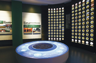 超级稻示范推广品种种子墙,通过圆形桌面互动装置可查询品种信息 隆平水稻博物馆供图