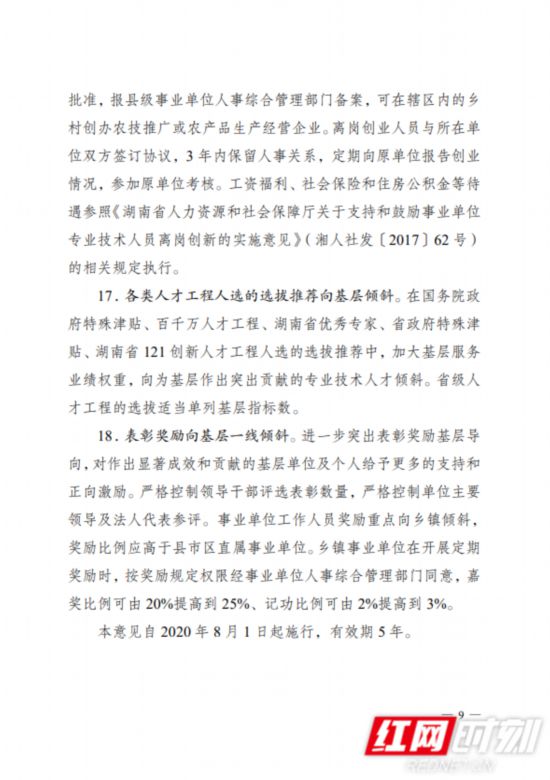 近日,湖南省人力资源和社会保障厅印发《关于加强基层事业单位人事人才工作的若干意见》(以下简称《意见》),从落实基层事业单位人员工资福利待遇、完善激励机制等六大方面制定18条意见,加强基层事业单位人事人才工作,拓展基层事业单位人员职业空间,强化待遇保障,引导人才服务基层、扎根基层。《意见》自2020年8月1日起施行,有效期5年。