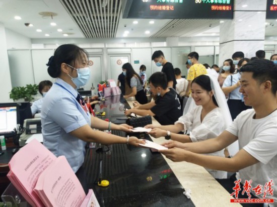 (8月25日,在长沙市岳麓区民政局婚姻登记处,婚姻登记员正在给新人颁发结婚证。记者 杨昱 摄)