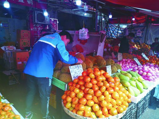 “叮!微信支付收款18.8元!”“要水果吗?便宜卖了!”在市场的水果零售处,各路商家操着不同的口音热情吆喝,微信的收款声也此起彼伏。每每有客人掀起塑料隔热帘走进市场内,几个老板便抬起头打量起来。