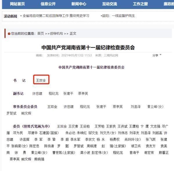 5月13日,湖南省纪委监委官网信息显示,王双全已出任湖南省第十一届纪律检查委员会书记。