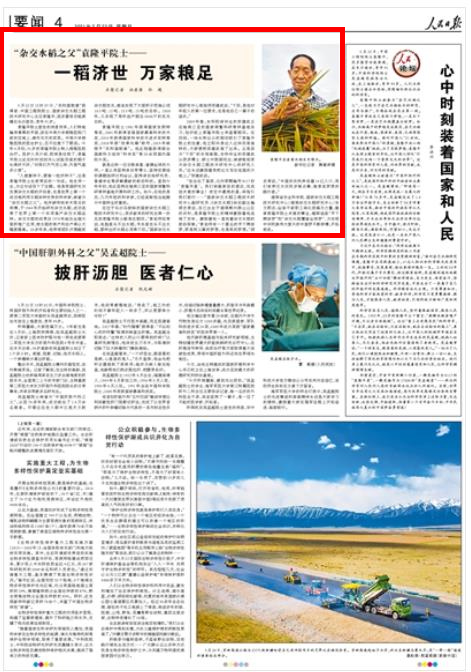 “人就像种子,要做一粒好种子”,这是袁隆平院士生前常说的一句话。他也用一生,为这句话写下了注脚。他是我国研究与发展杂交水稻的开创者,也是世界上第一个成功地利用水稻杂种优势的科学家,被誉为“杂交水稻之父”。他冲破传统学术观点的束缚,于1964年开始研究杂交水稻,成功选育了世界上第一个实用高产杂交水稻品种。杂交水稻的成果自1976年起在全国大面积推广应用,使水稻的单产和总产得以大幅度提高。20多年来,他带领团队开展超级杂交稻攻关,接连实现了大面积示范每公顷10.5吨、12吨、13.5吨、15吨的目标。2020年,又实现了周年亩产稻谷3000斤的攻关目标。