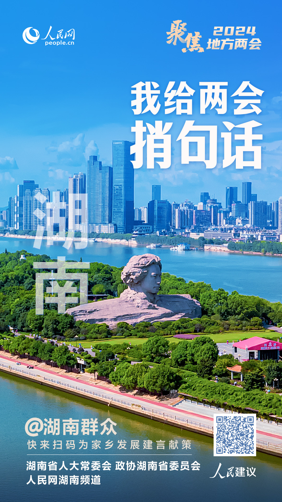 2024年1月23日,湖南省两会召开。即日起,人民网联合湖南人大常委会、政协湖南省委员会推出“我给湖南两会捎句话”大型建言征集活动(简称“捎句话”活动),广大网友可通过人民网“领导留言板”小程序、“人民网+”客户端等渠道,为家乡发展积极建言献策。