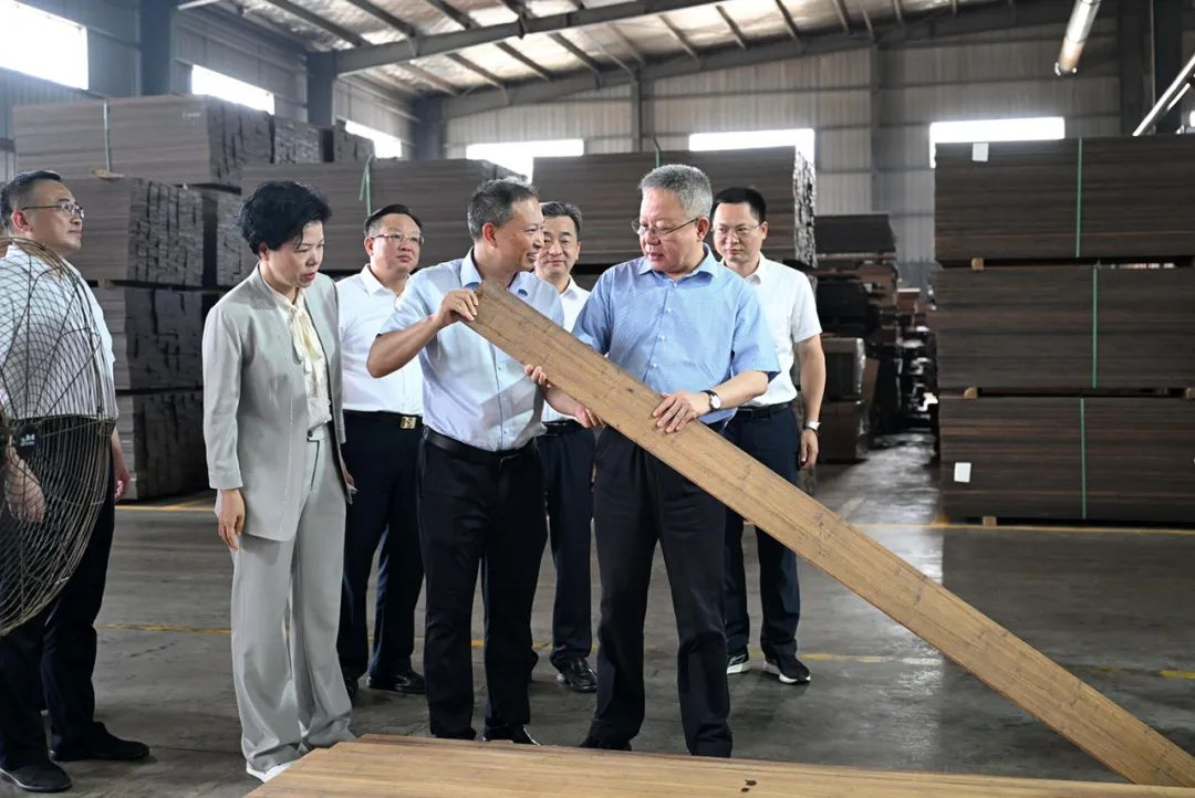 2023年8月8日,沈晓明走进湖南桃花江竹材科技股份有限公司的生产车间,详细了解竹产品加工、产品创新、市场拓展等情况。(图源:湖南省人民政府门户网站)