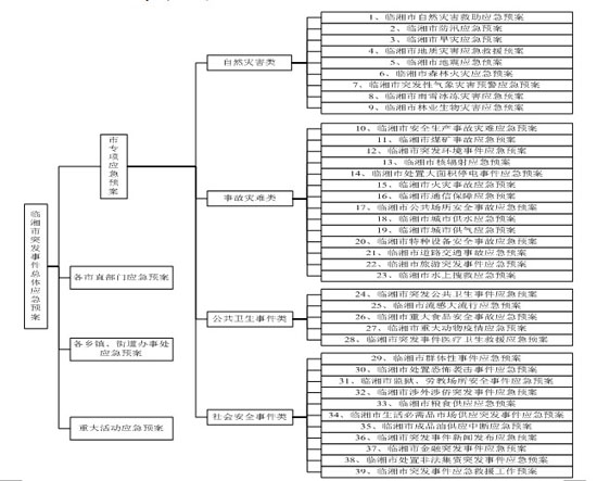 (1)市突发事件总体应急预案。《临湘市突发事件总体应急预案》(以下简称市总体应急预案)是全市应急预案体系的总纲,是市人民政府应对本市突发事件的规范性文件和行动指南,由市人民政府制定并公布施行,报岳阳市政府备案。