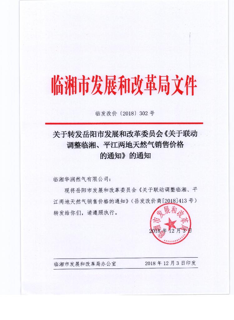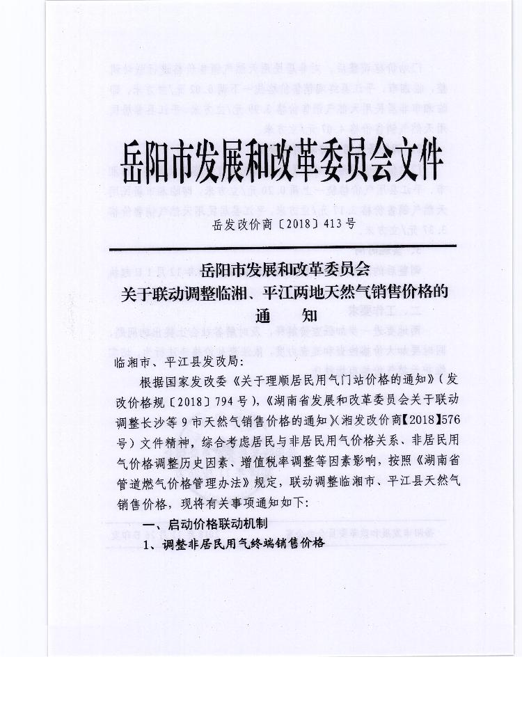 关于转发岳阳市发展和改革委员会《关于联动调整临湘、平江两地天然气销售价格的通知》的通知