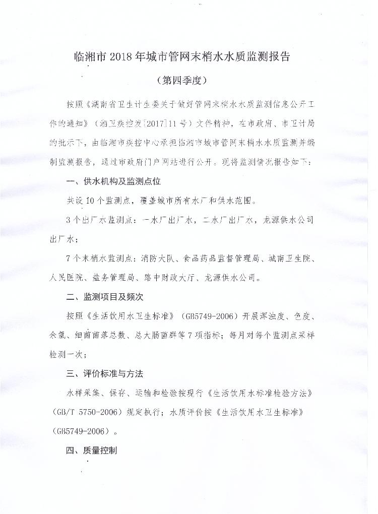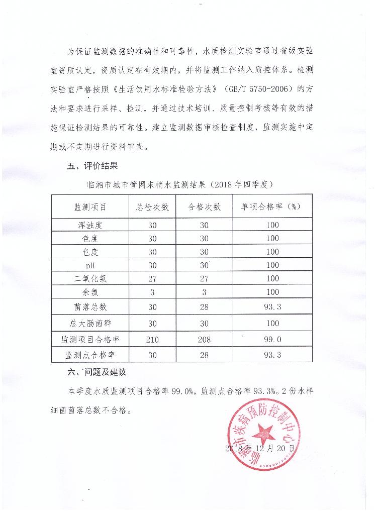 临湘市2018年城市管网末梢水水质监测报告(第四季度)