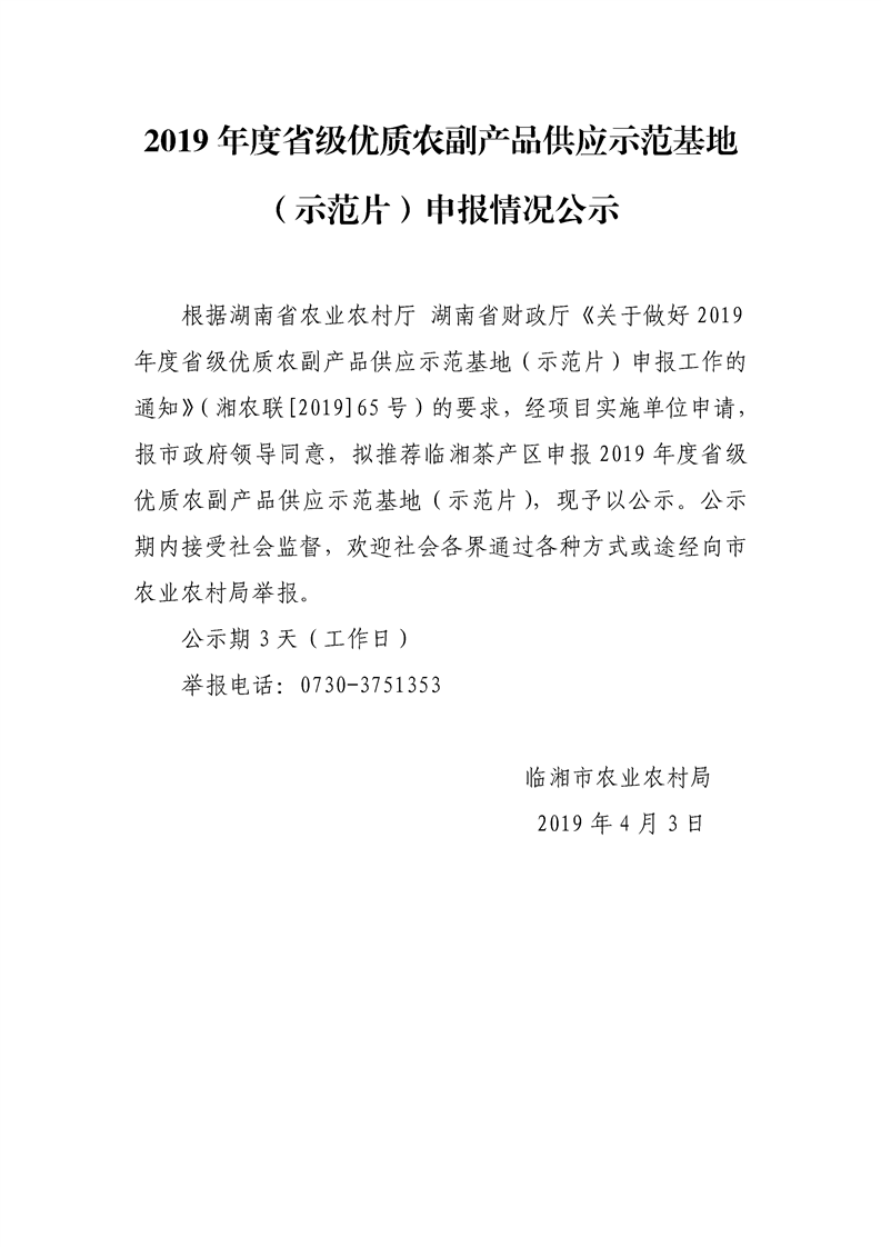 2019年度省级优质农副产品供应示范基地(示范片)申报情况公示