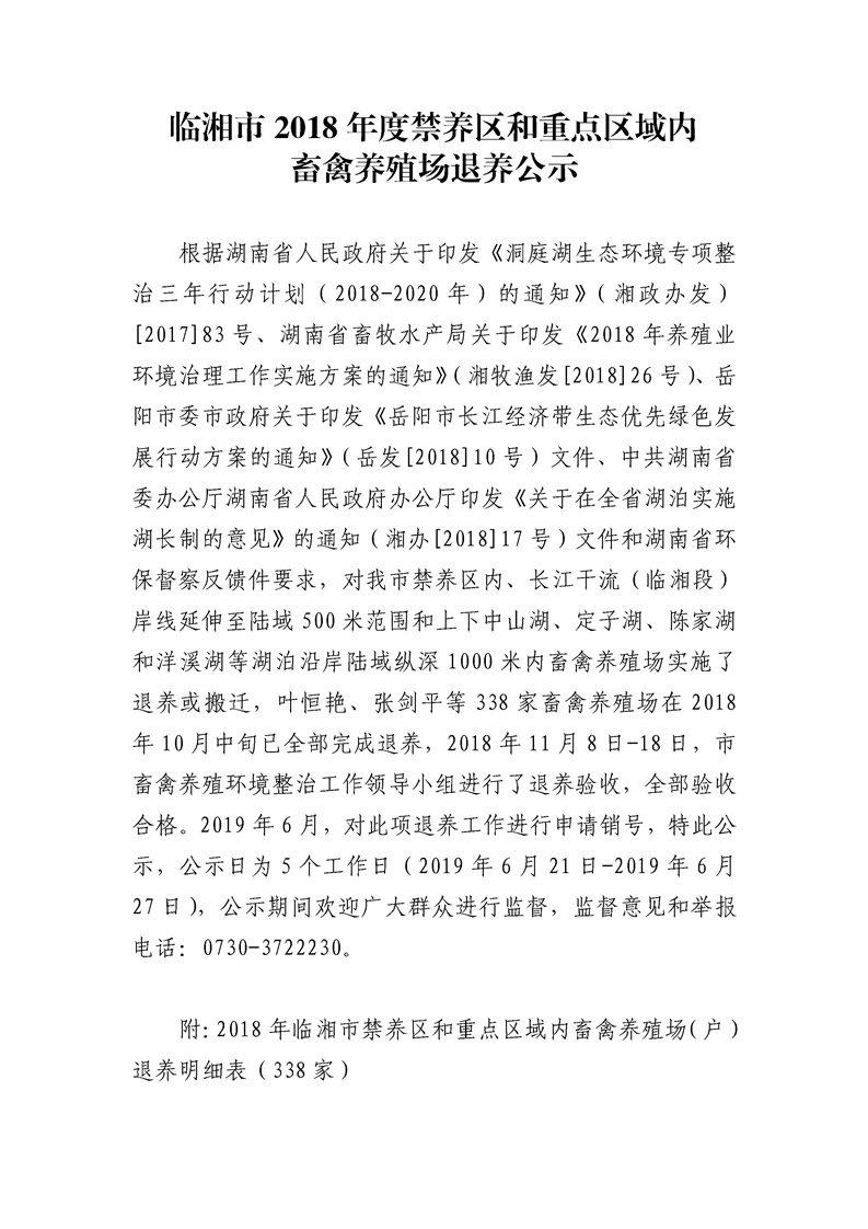 临湘市2018年度禁养区和重点区域内畜禽养殖场退养公示