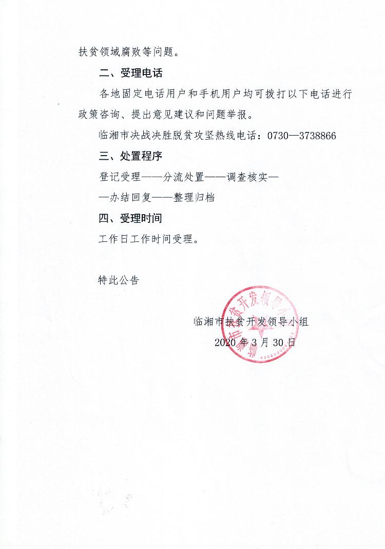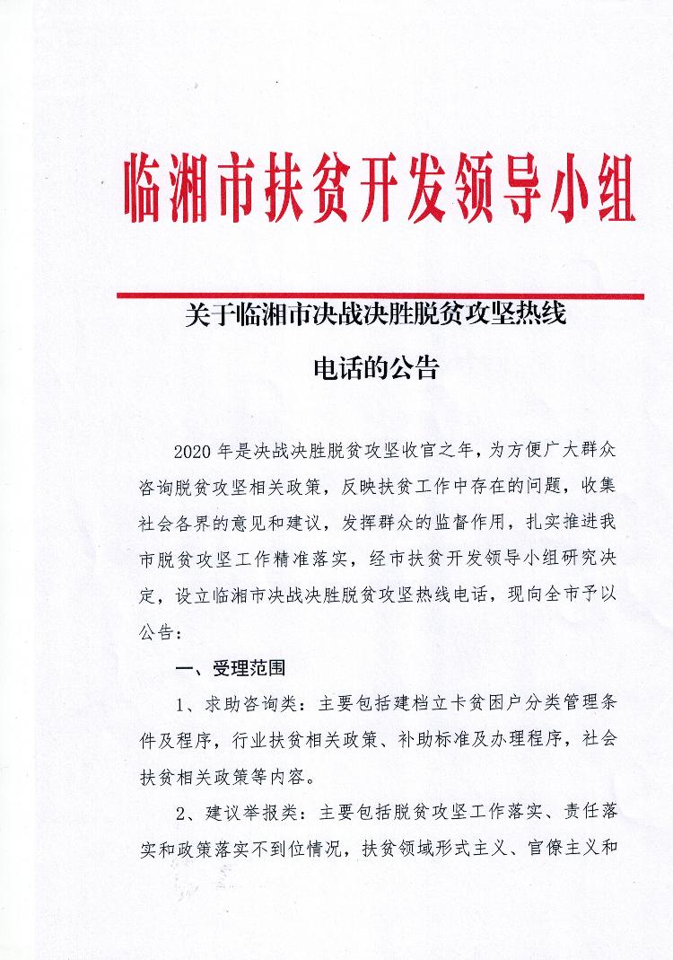 关于临湘市决战决胜脱贫攻坚热线电话的公告
