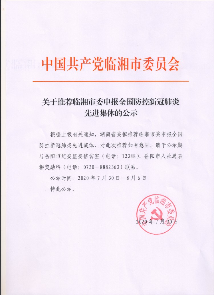 关于推荐临湘市委申报全国防控新冠肺炎先进集体的公示