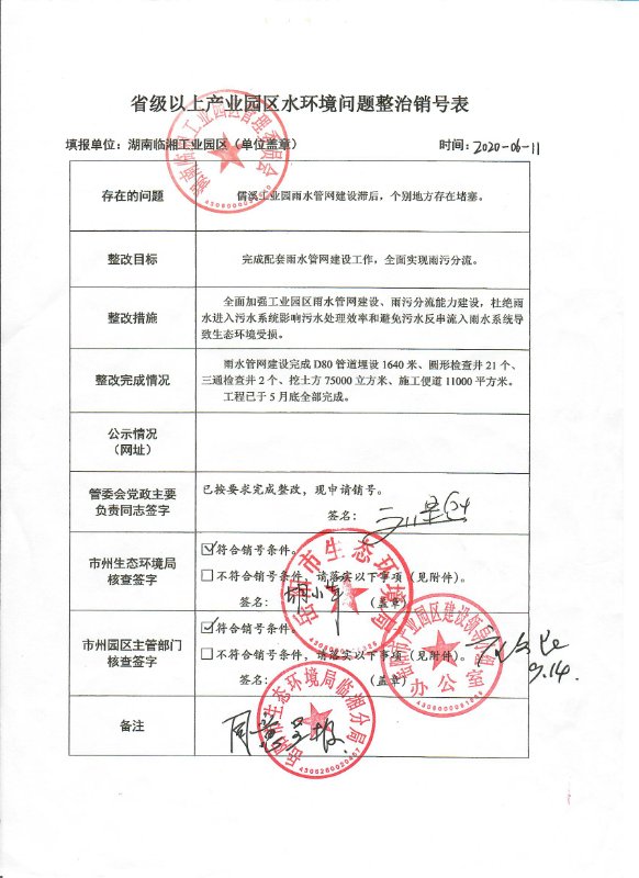 省级以上产业园区水环境问题整治销号表
