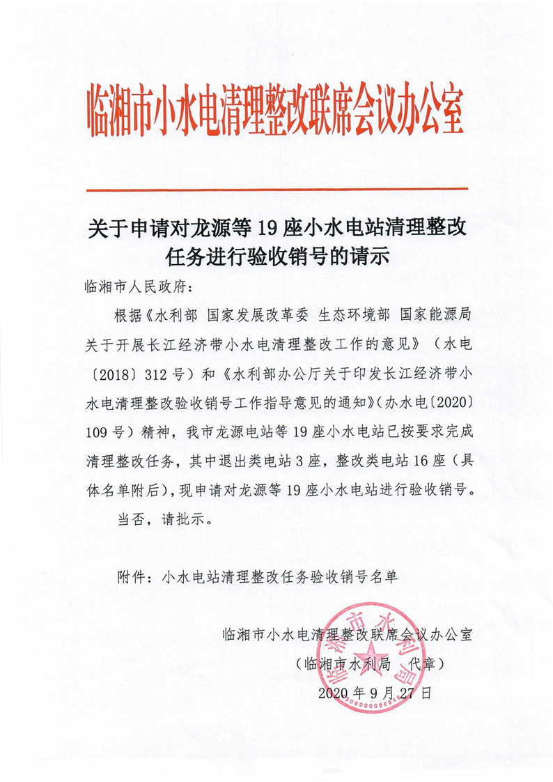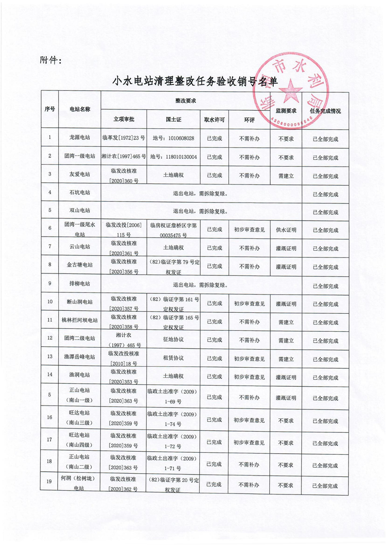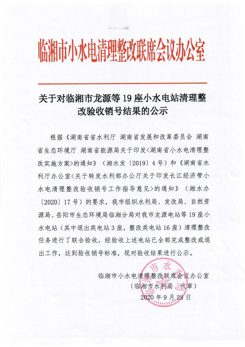 关于对临湘市龙源等19座小水电站清理整改验收销号结果的公示