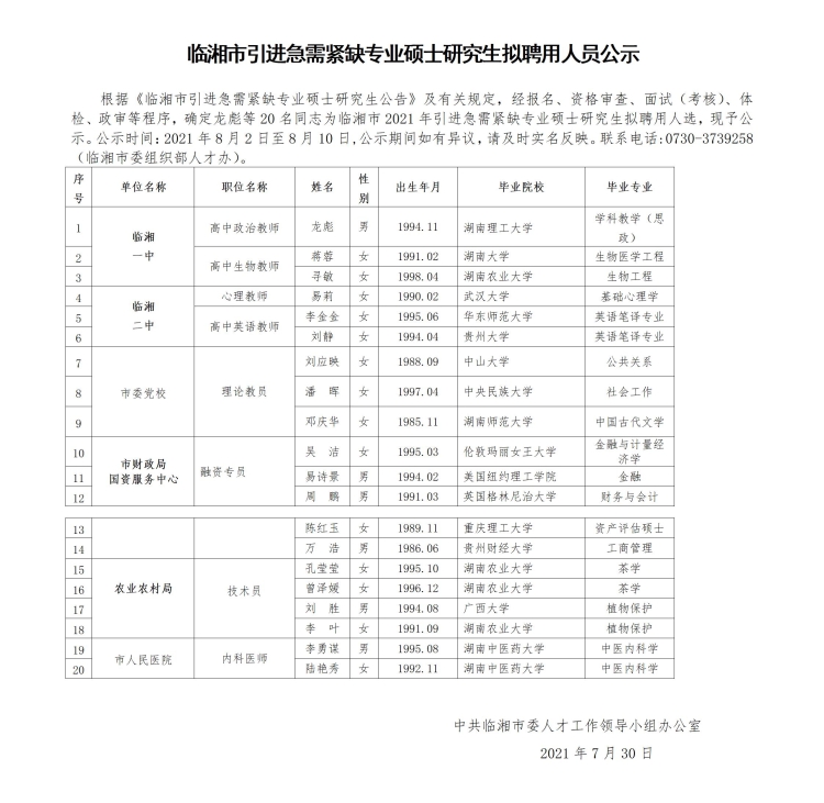 临湘市引进急需紧缺专业硕士研究生拟聘用人员公示