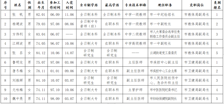 根据《临湘市公开选拔领导干部公告》相关规定,经现场报名、资格审查、部门联审、量化计分等环节,按照量化计分成绩从高到低排序,分类确定前5名竞职对象进入竞职演讲环节,现予以公示。