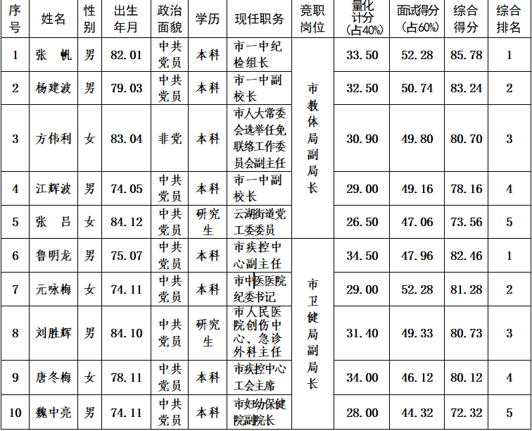 根据《临湘市公开选拔领导干部公告》相关规定,经现场报名、资格审查、量化计分、竞职面试等环节,分类按综合得分从高到低排序,并按1:2的比例确定考察对象,现予以公示。