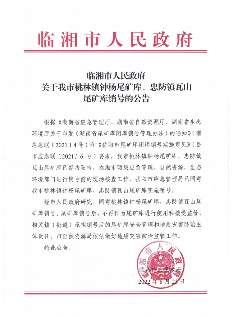 关于我市桃林镇钟杨尾矿库、忠防镇瓦山尾矿库销号的公告